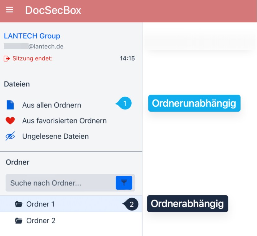 Ist ein Benutzer einem Unterordner zugewiesen aber dessen übergeordneten Ordnern nicht, sieht dieser im Hauptmenü ebenfalls alle übergeordneten Ordner, die notwendig sind, um den Unterordner richtig anzeigen zu können (zum aus- und einklappen). Der Benutzer sieht jedoch immer nur den Namen des Ordners. Wird versucht in einen solchen Ordner zu navigieren, werden wie erwartet keine Dateien des Ordners angezeigt, da der Benutzer diesem Ordner gar nicht zugewiesen ist.